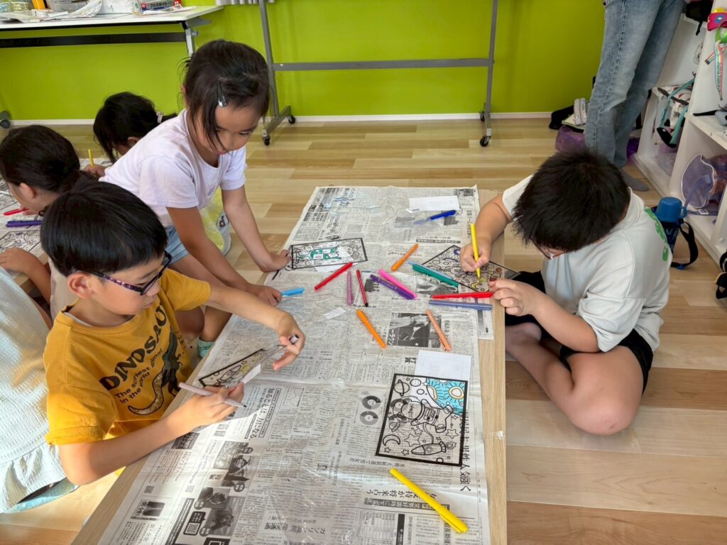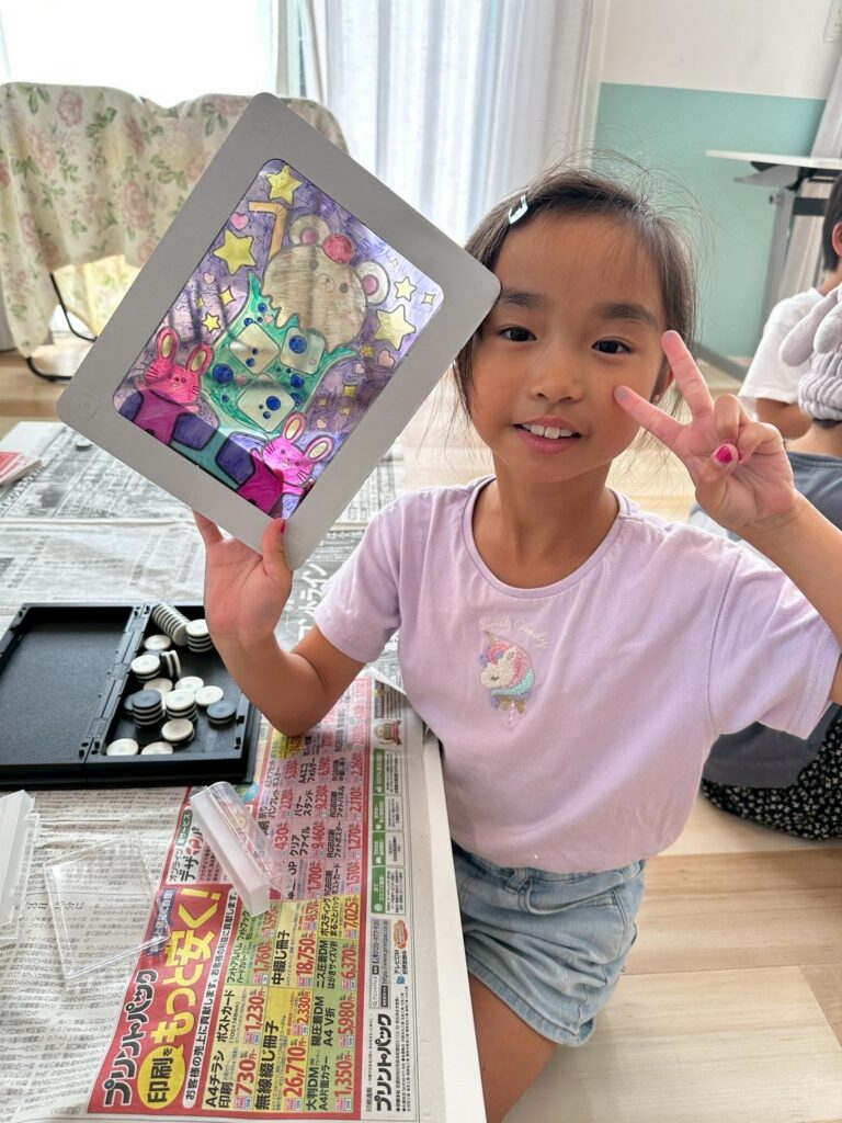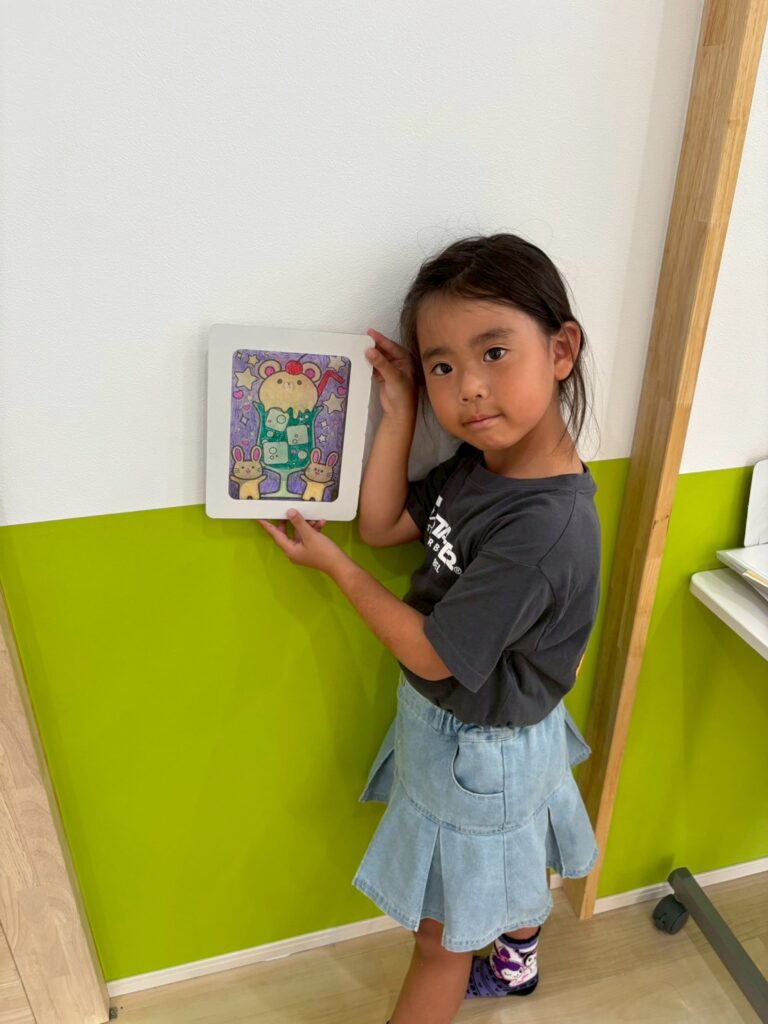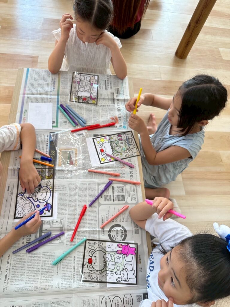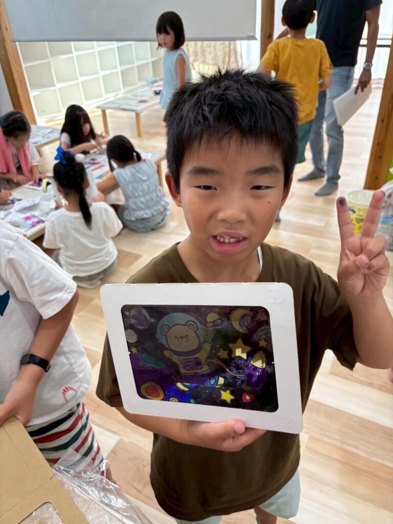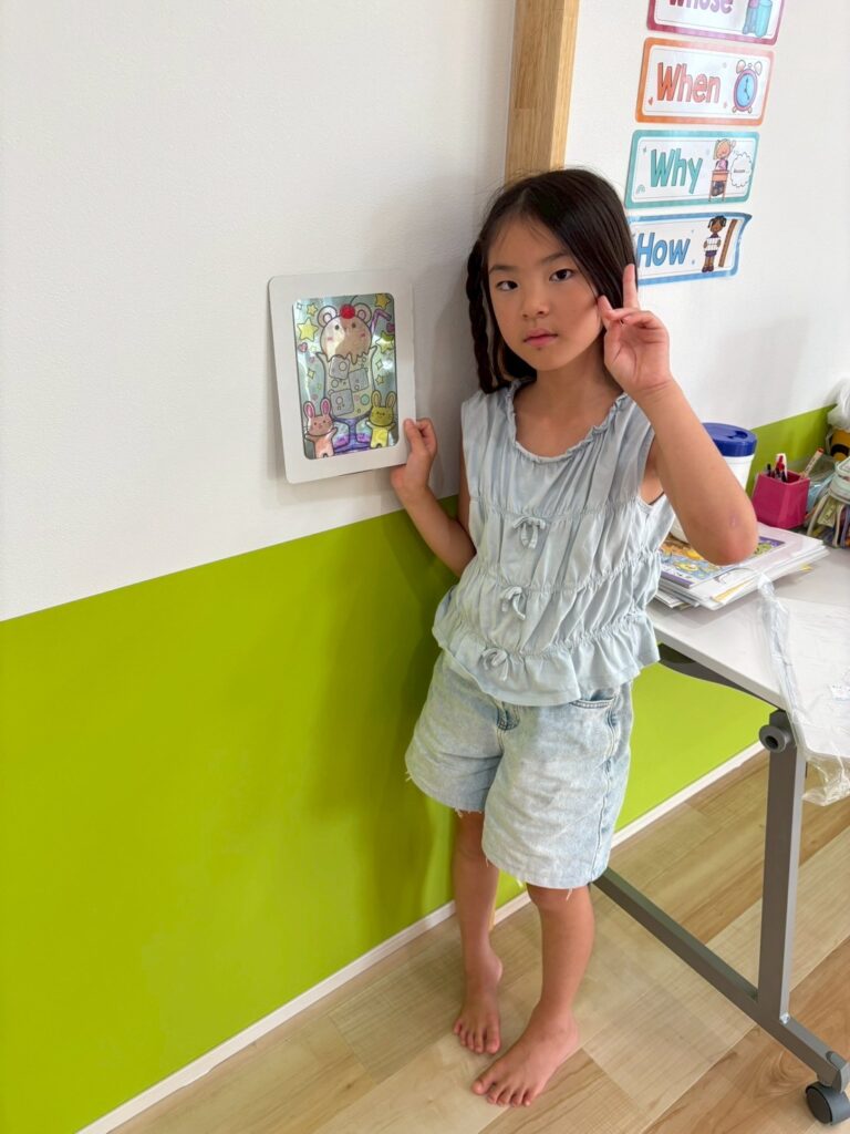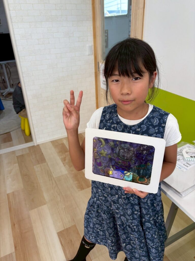 ステンドグラス風アート🎨 2025.8.19 お知らせ 今日の午後は ステンドグラス風の塗り絵 に挑戦。透明なシートに色を塗ると光を通してキラキラ輝き、本物のステンドグラスのように見えました。完成した作品を窓に貼ると「So beautiful!」と笑顔いっぱい。色の組み合わせを工夫しながら、それぞれ個性あふれる作品ができあがりました。 今日も子ども達は「楽しい!」「もっとやりたい!」と充実した一日を過ごしてくれました✨ URL Copied!