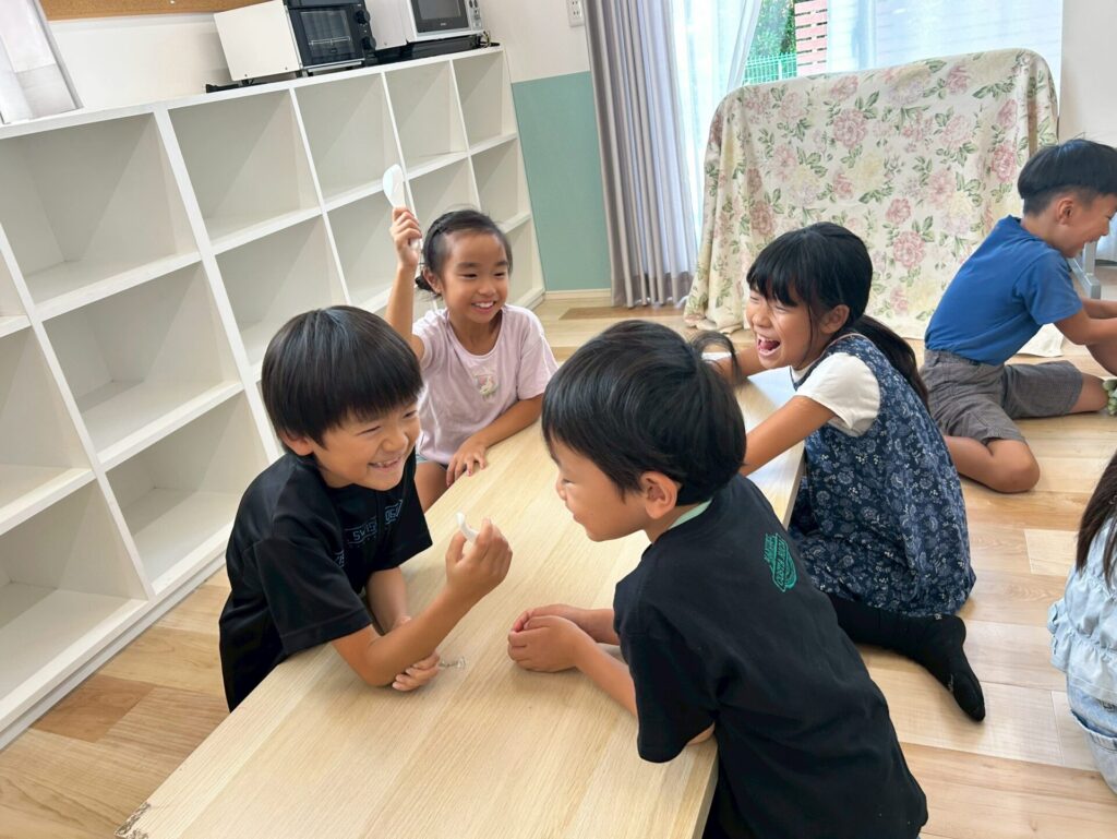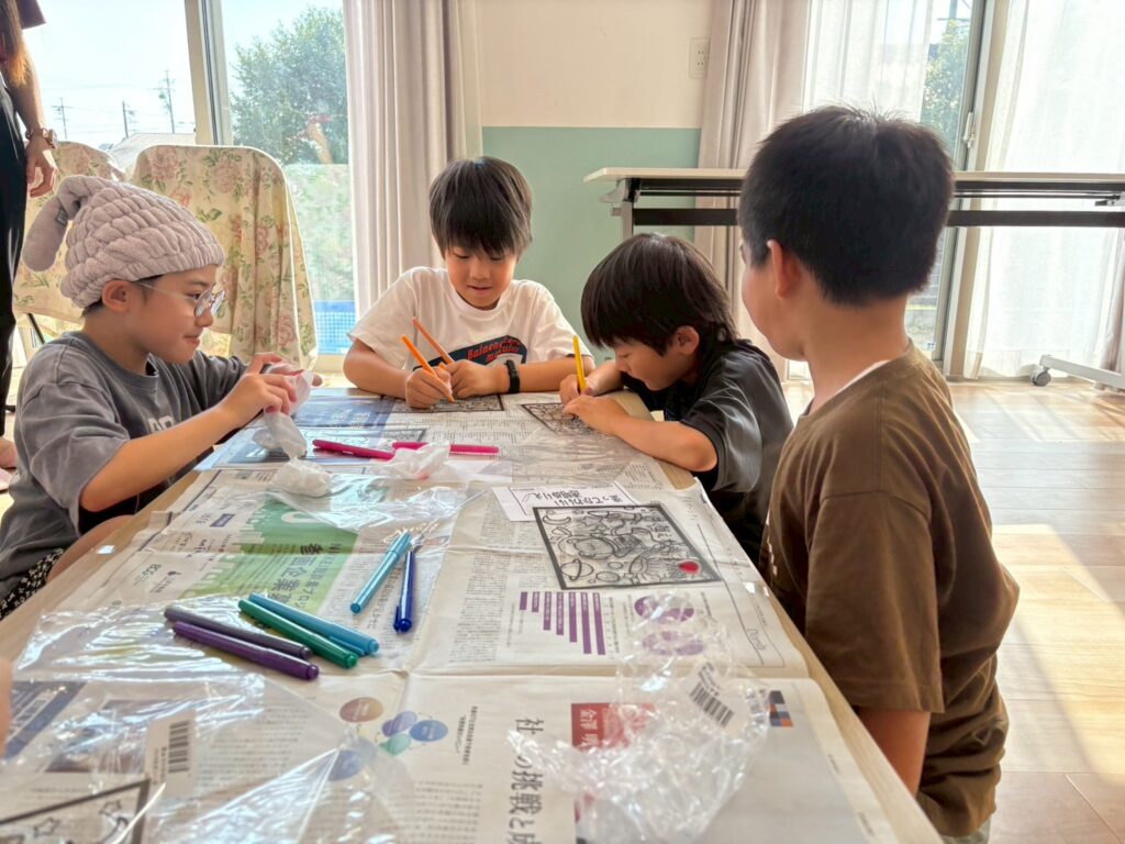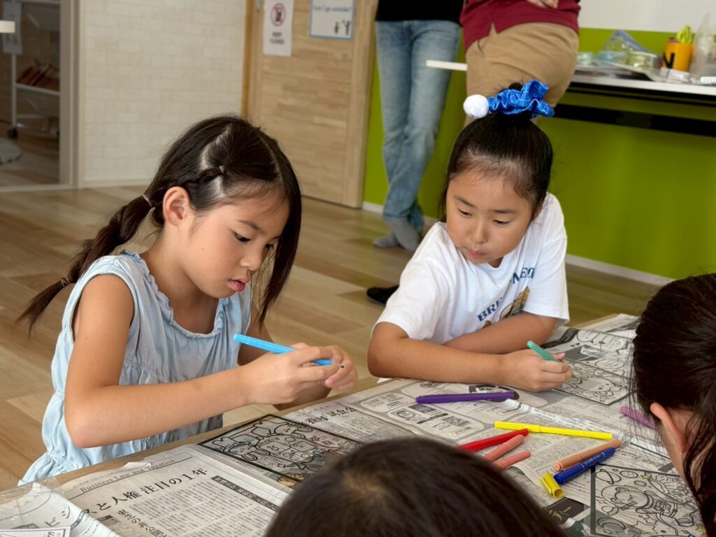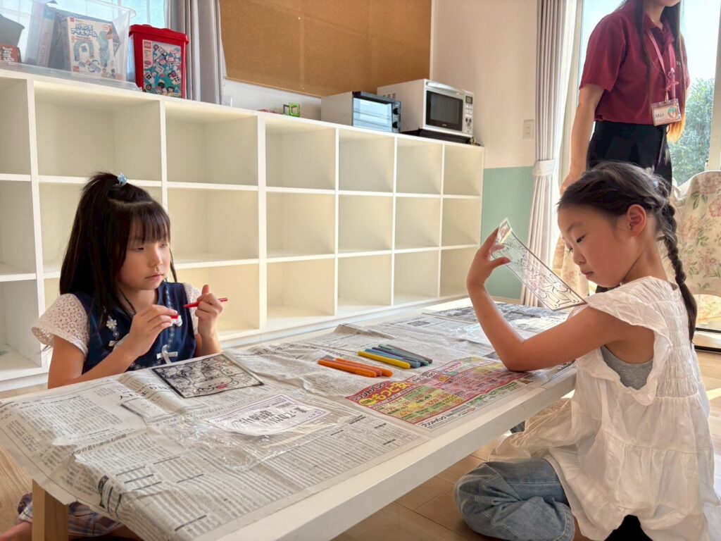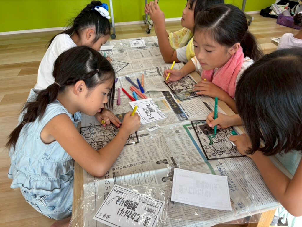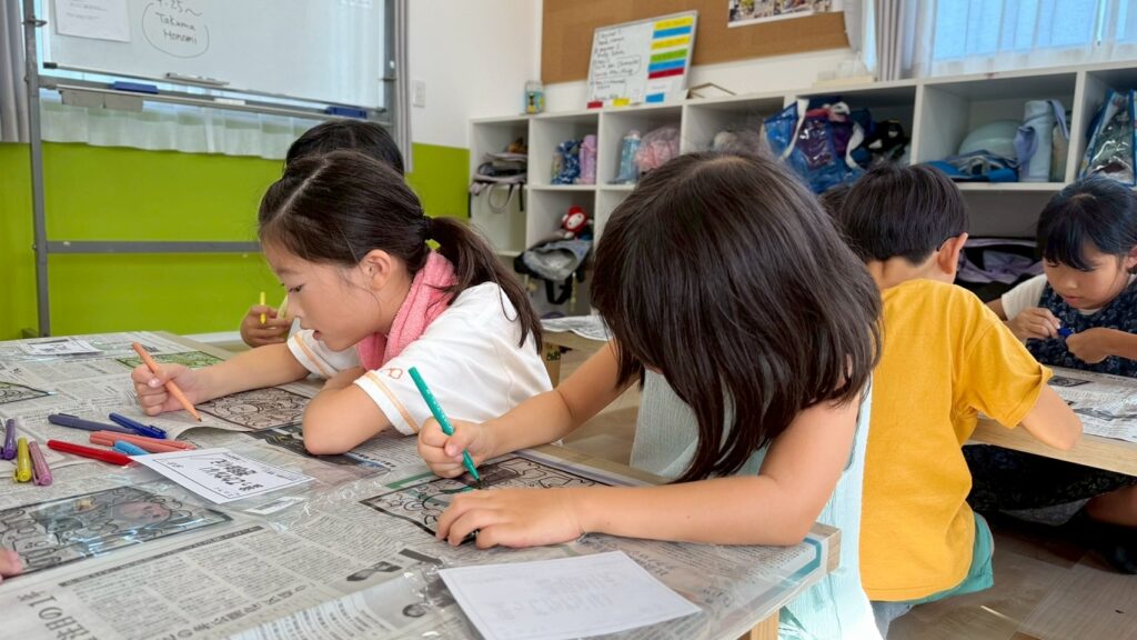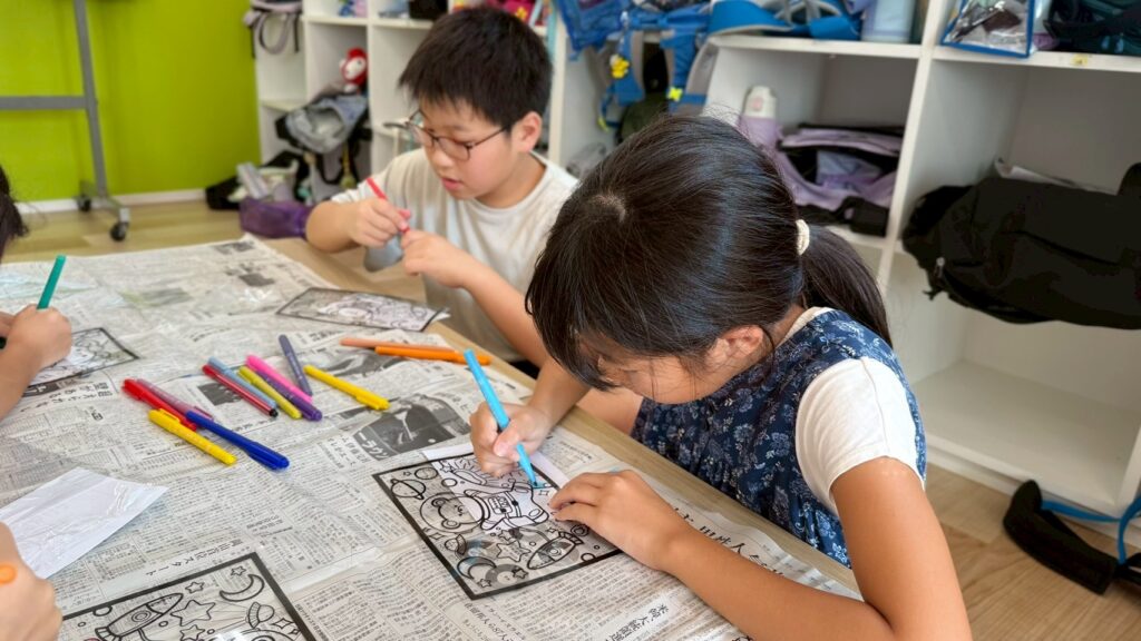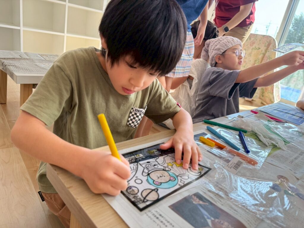 ステンドグラス風アート🎨 2025.8.19 お知らせ 今日の午後は ステンドグラス風の塗り絵 に挑戦。透明なシートに色を塗ると光を通してキラキラ輝き、本物のステンドグラスのように見えました。完成した作品を窓に貼ると「So beautiful!」と笑顔いっぱい。色の組み合わせを工夫しながら、それぞれ個性あふれる作品ができあがりました。 今日も子ども達は「楽しい!」「もっとやりたい!」と充実した一日を過ごしてくれました✨ URL Copied!