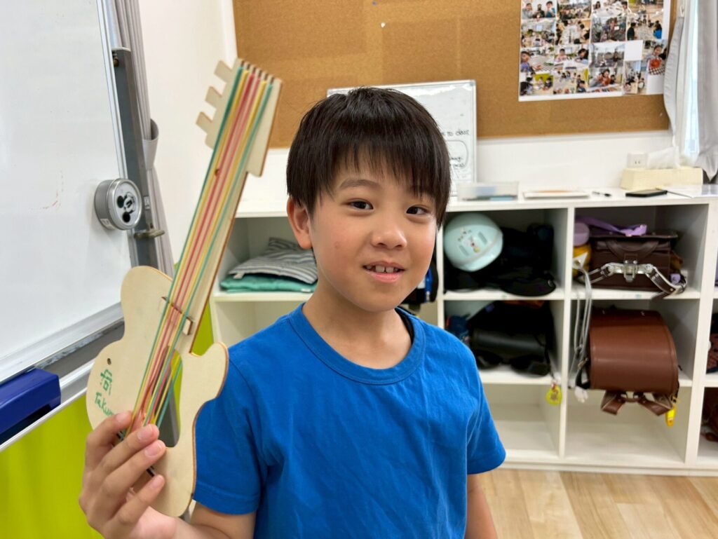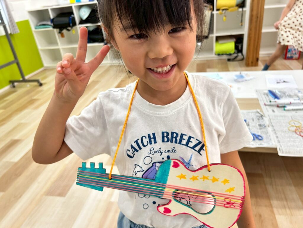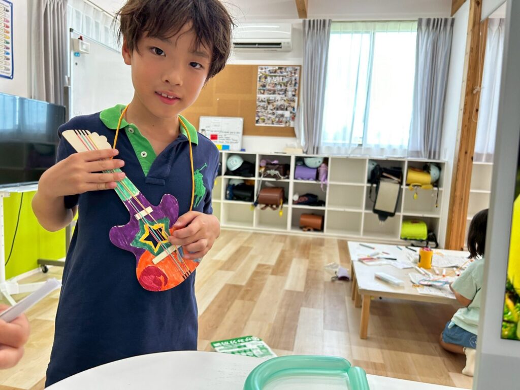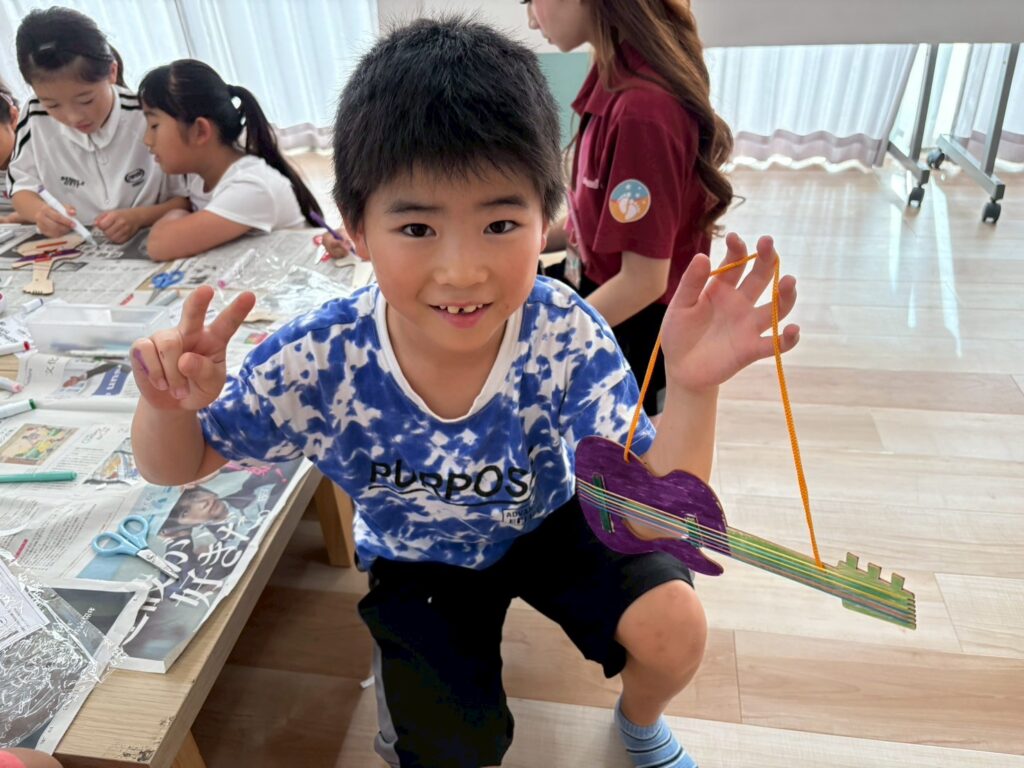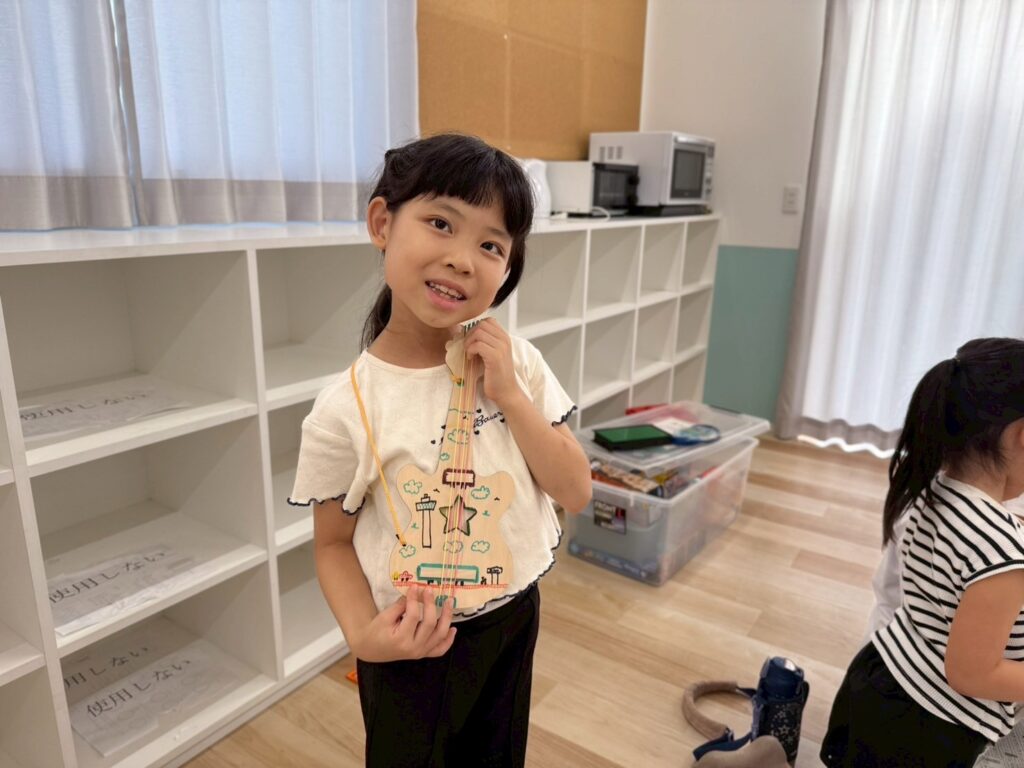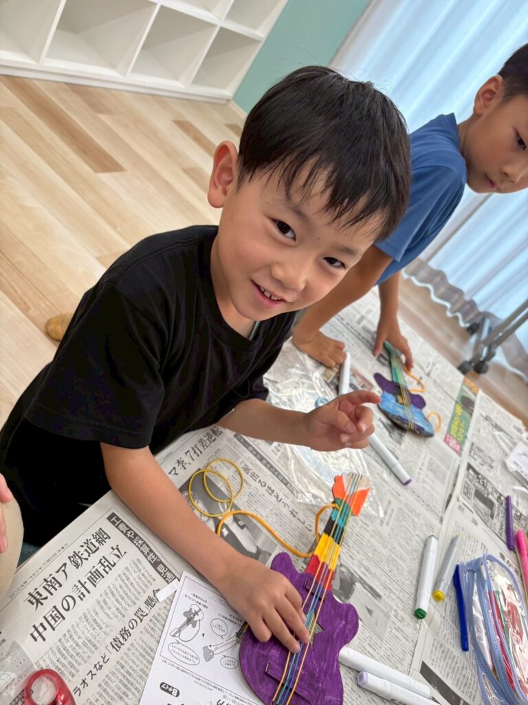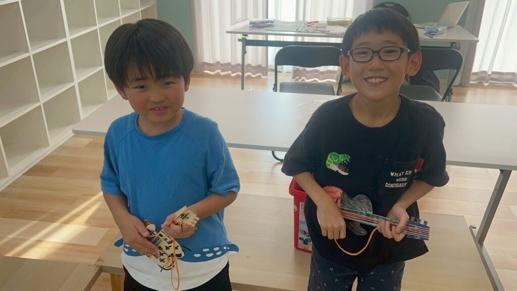 完成したギターを首からかけて「ジャーン!」と鳴らすようにポーズを決める子、友達と一緒にバンドごっこを始める子、集中して細かい部分を工夫する子など、みんな本当に楽しそうでした。最後には “I did it!”(できた!)と嬉しそうな声がたくさん聞こえました。