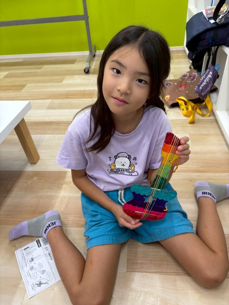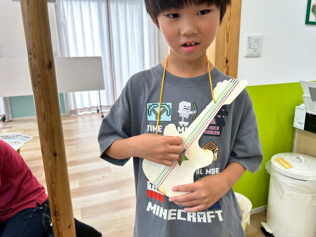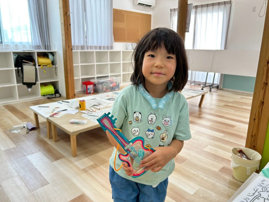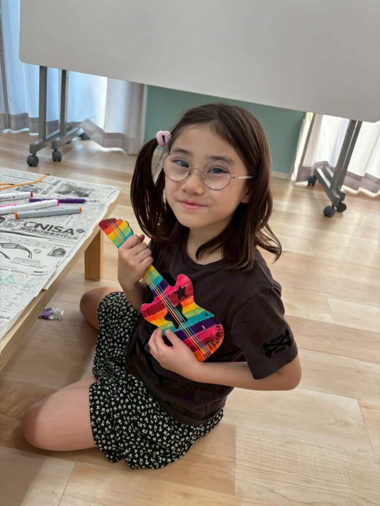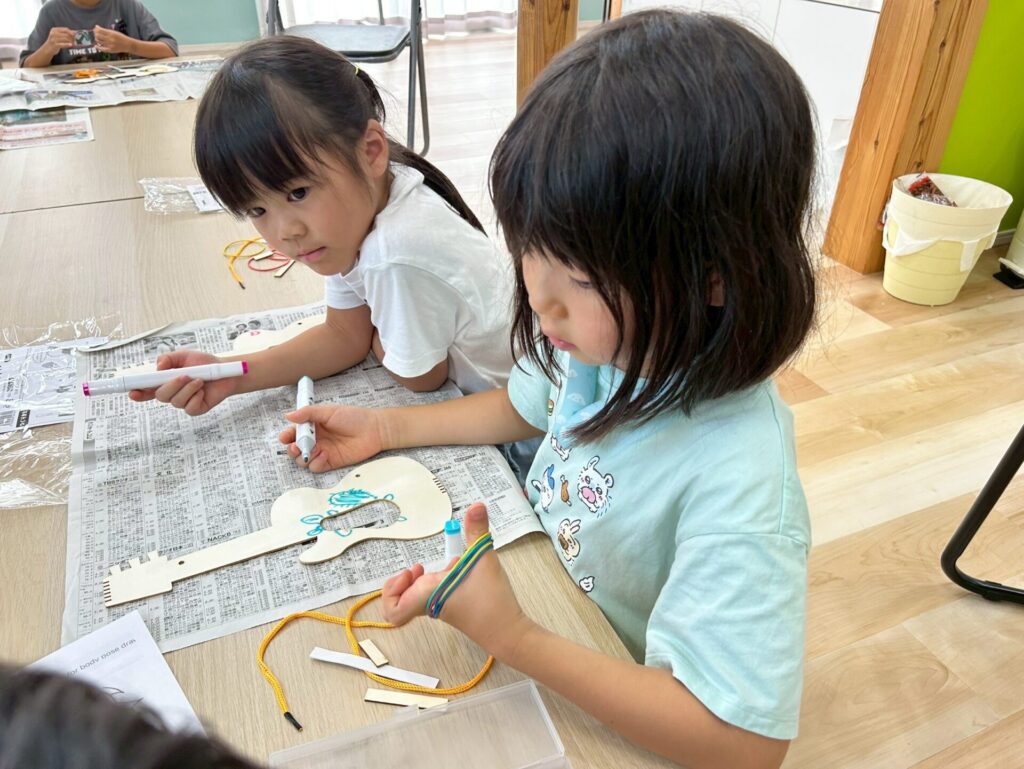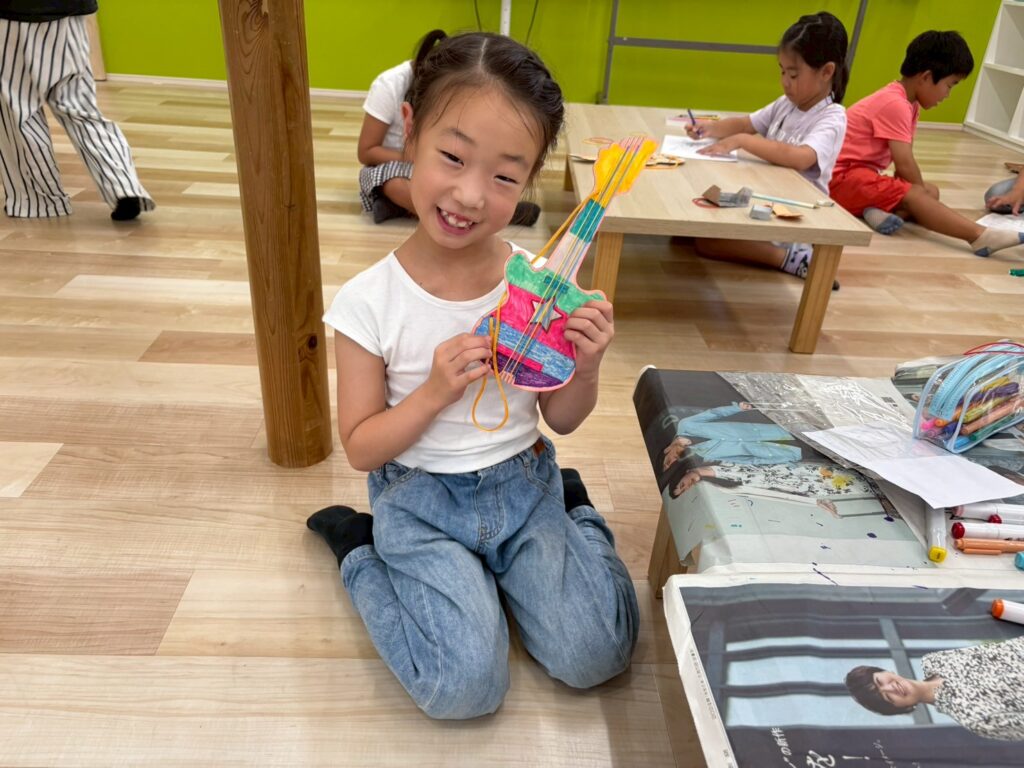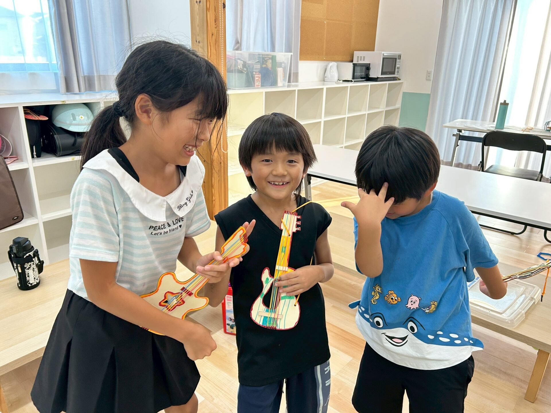 完成したギターを首からかけて「ジャーン!」と鳴らすようにポーズを決める子、友達と一緒にバンドごっこを始める子、集中して細かい部分を工夫する子など、みんな本当に楽しそうでした。最後には “I did it!”(できた!)と嬉しそうな声がたくさん聞こえました。