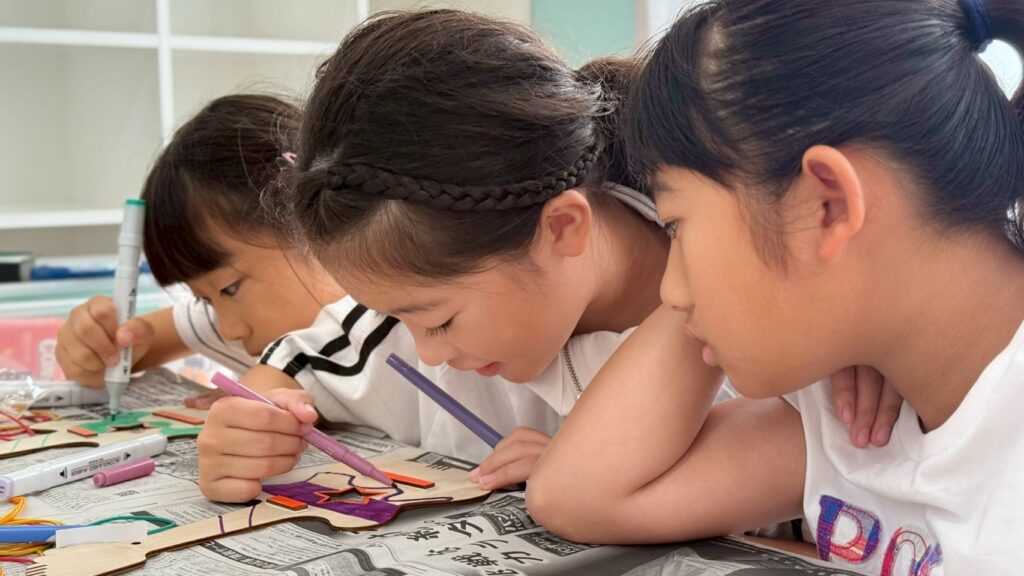 子供たちは色とりどりのペンやゴムを使って、自分だけのギターをデザインしました。作業中は “Can you give me the red marker?”(赤のペン貸して!)や “Look at my guitar!”(僕のギター見て!)など、自然に英語のフレーズが飛び交いました。