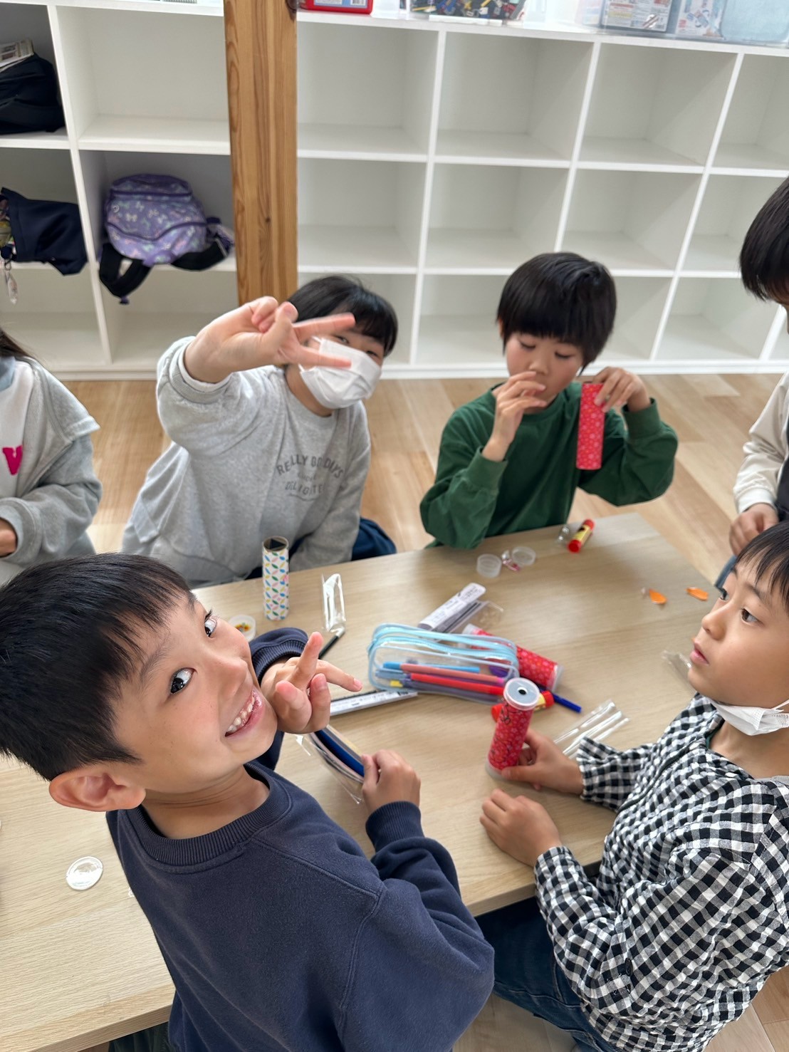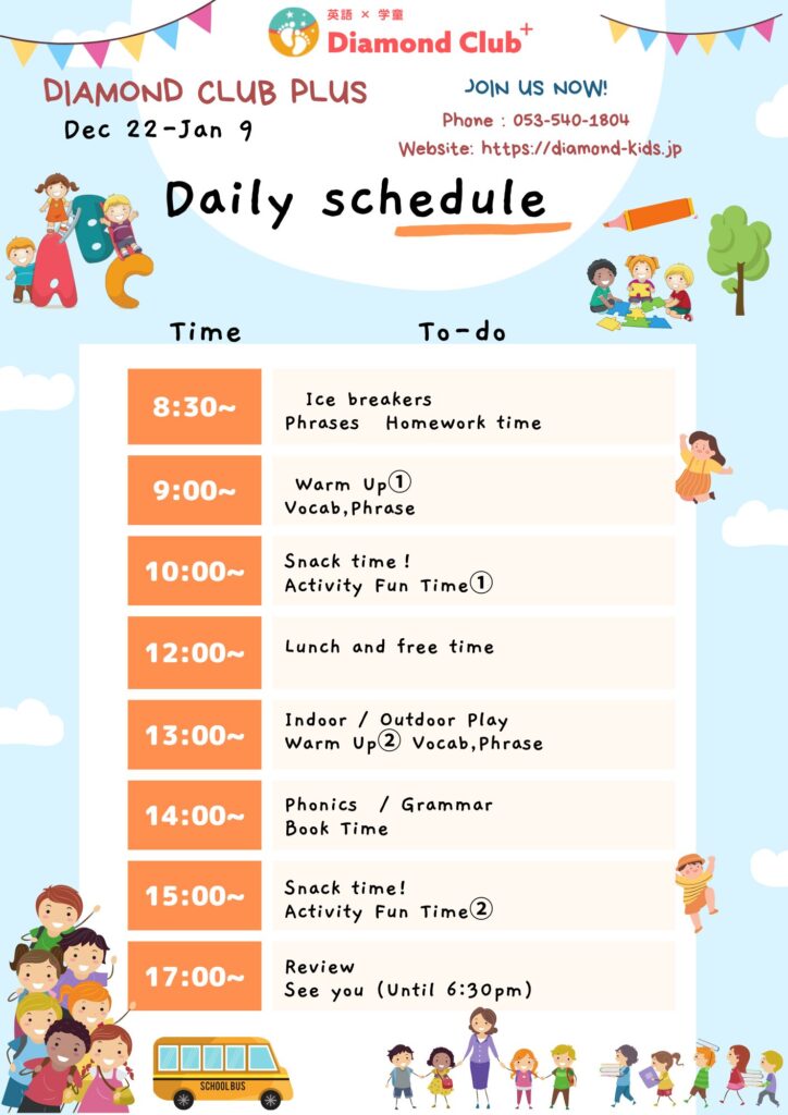 持ち物: 水筒(大)、お弁当(1日お預かりの日のみ)、筆記用具、宿題 ※必要な人は自由時間に学校の宿題を行うことが可能