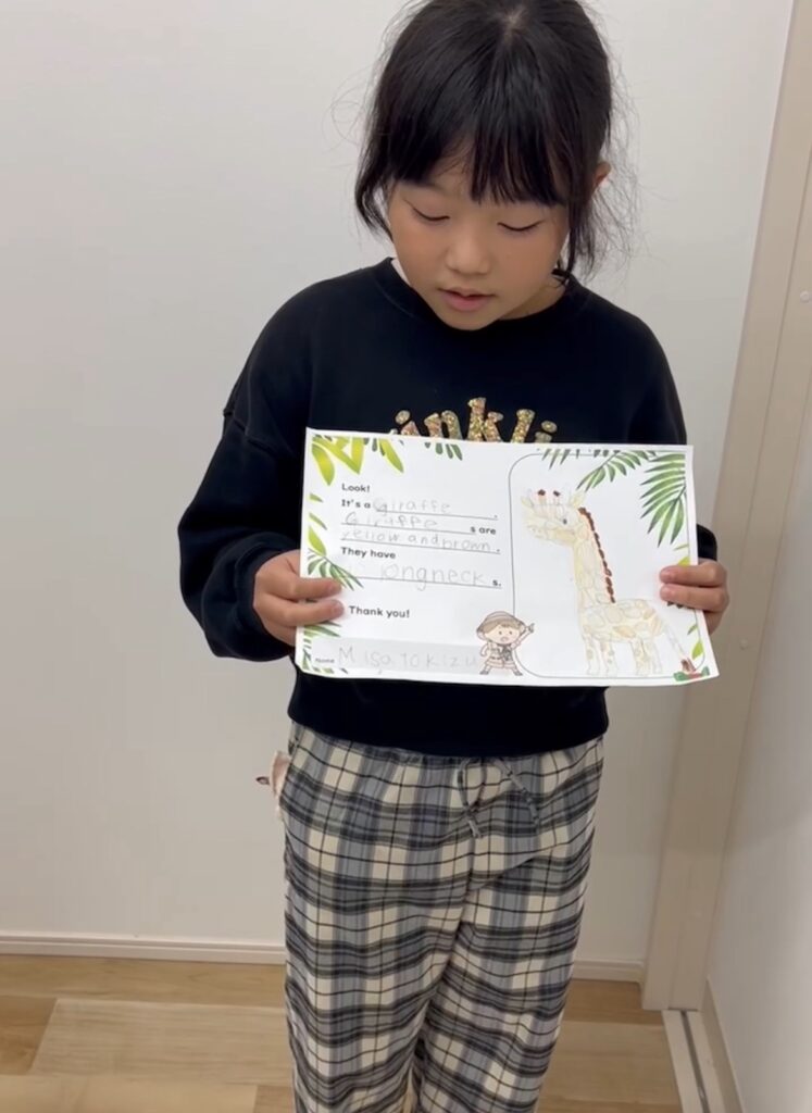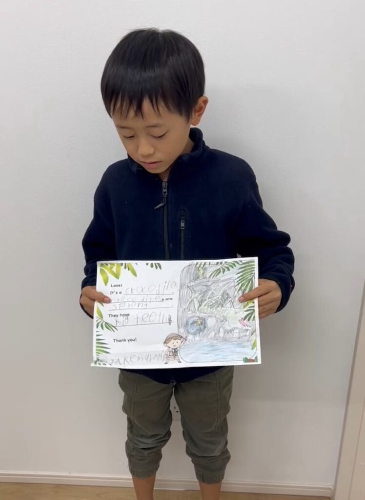 「It’s a crocodile!」「They have big teeth!」など、練習した英語のフレーズを使って、一人ずつ自信をもって発表できました!