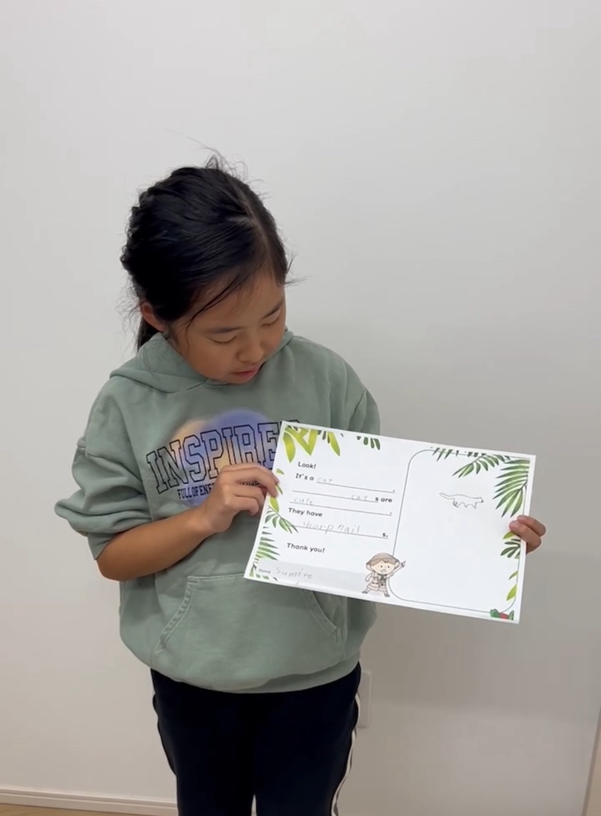 「It’s a crocodile!」「They have big teeth!」など、練習した英語のフレーズを使って、一人ずつ自信をもって発表できました!