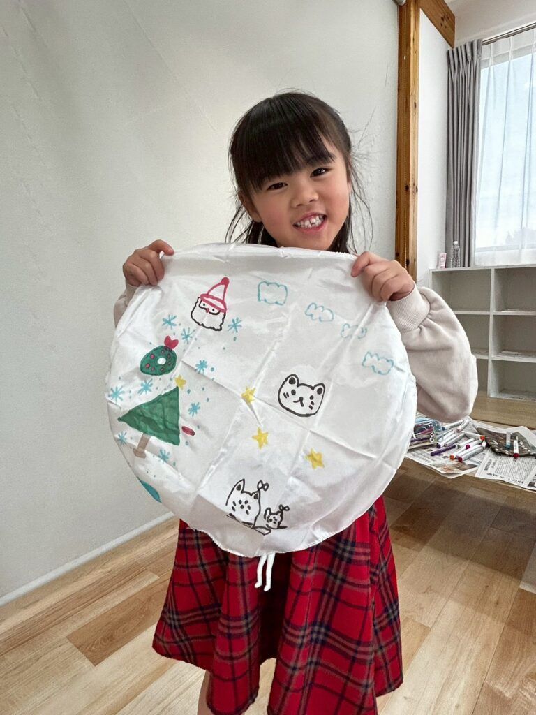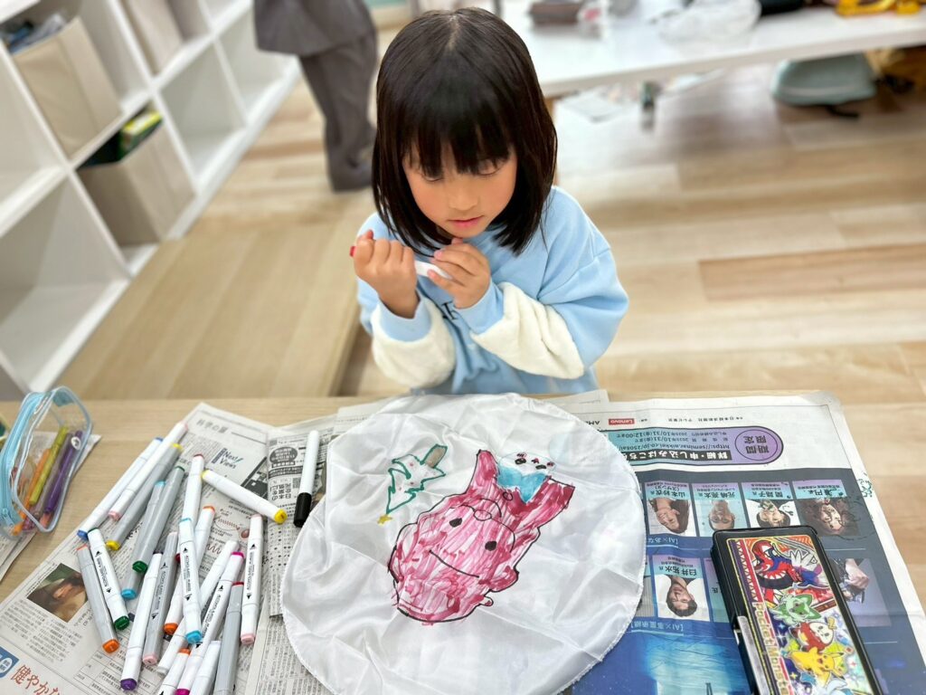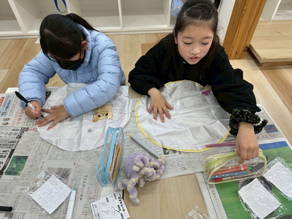 ビニール素材のパラシュートに、思い思いの絵を描いたり色を塗ったりしながら、世界にひとつだけのオリジナル作品を作っていきます。