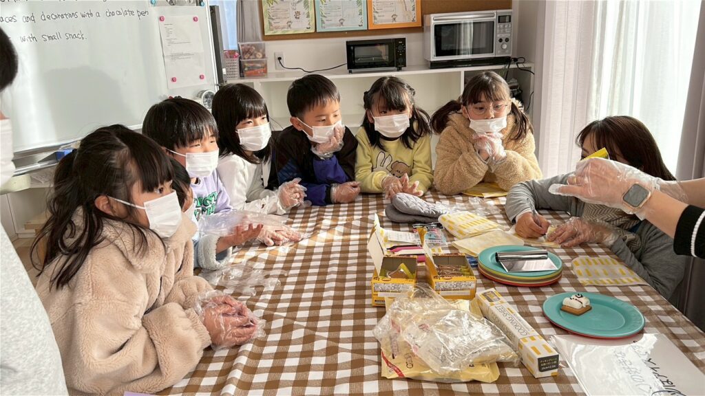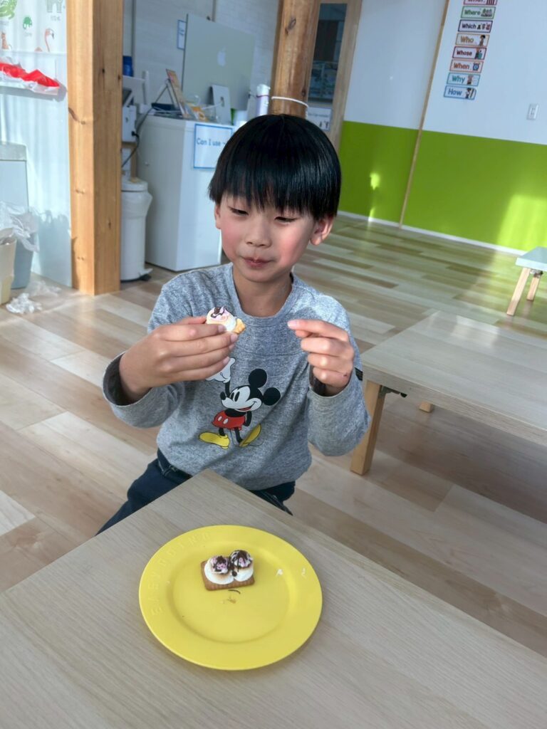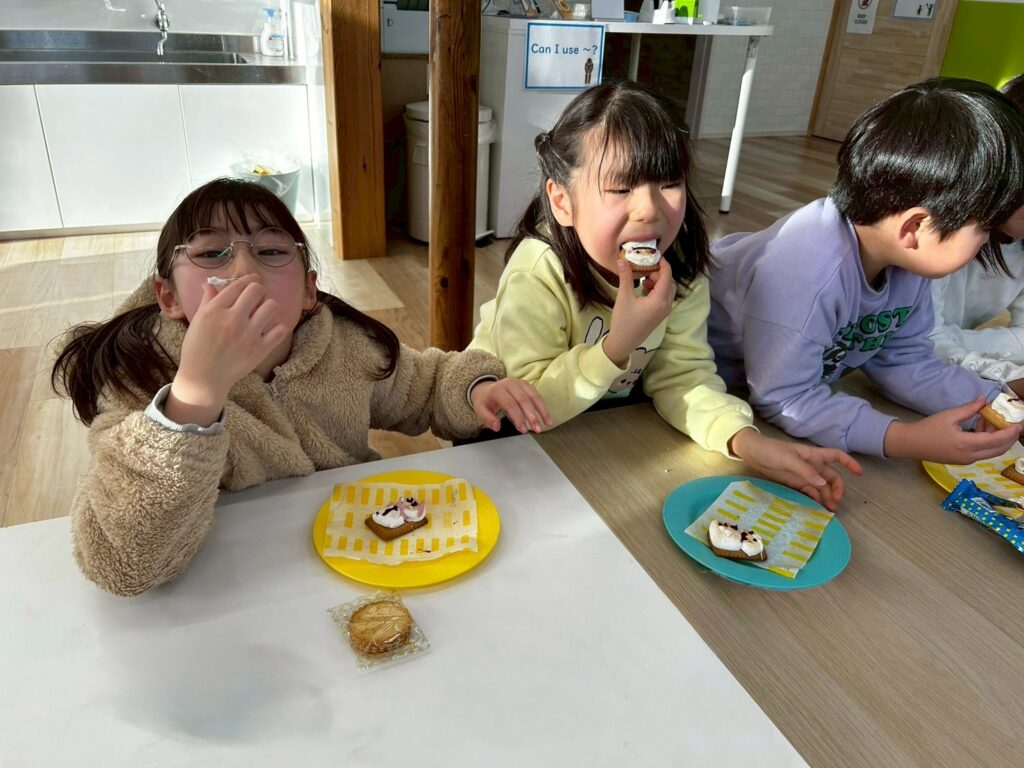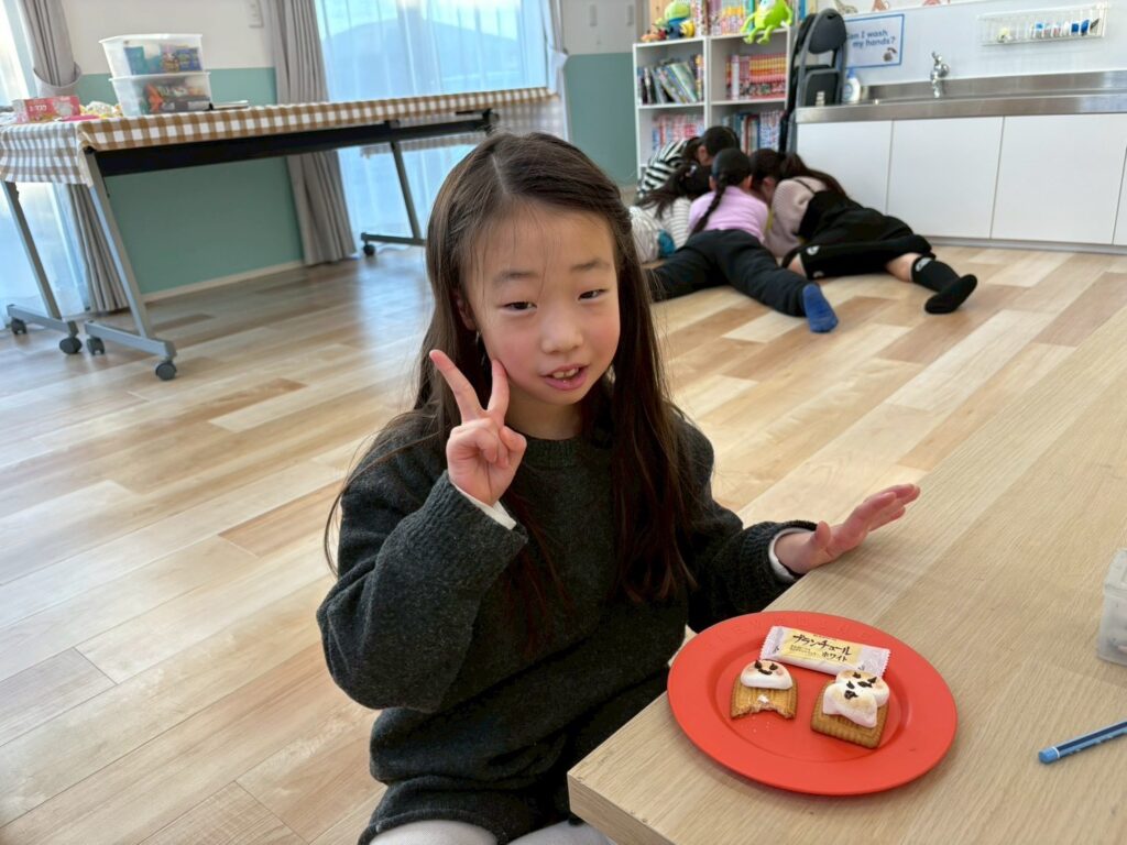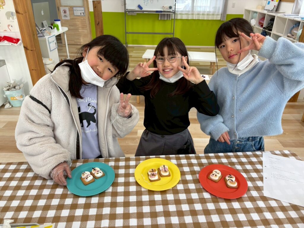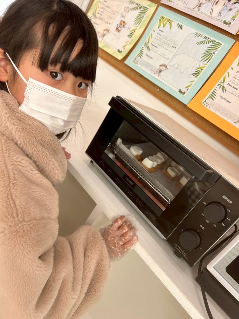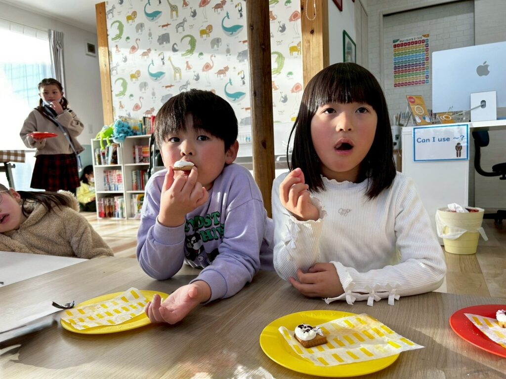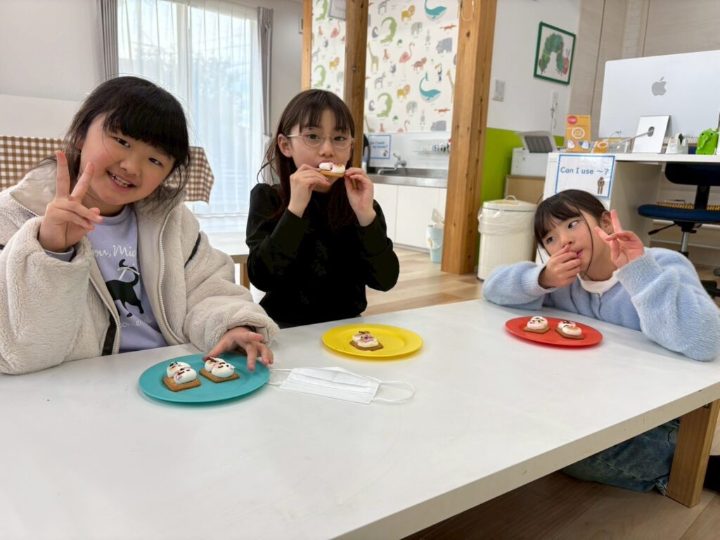 作る楽しさだけでなく、英語でやり取りをしながら進めることで、自然に表現も身についていきます。最後はみんなで「It’s delicious!」と笑顔いっぱい。楽しく学び、美味しく味わった冬のひとときとなりました。