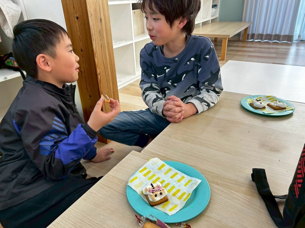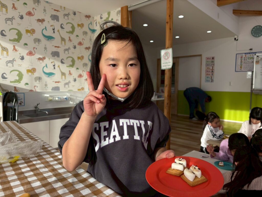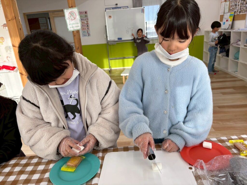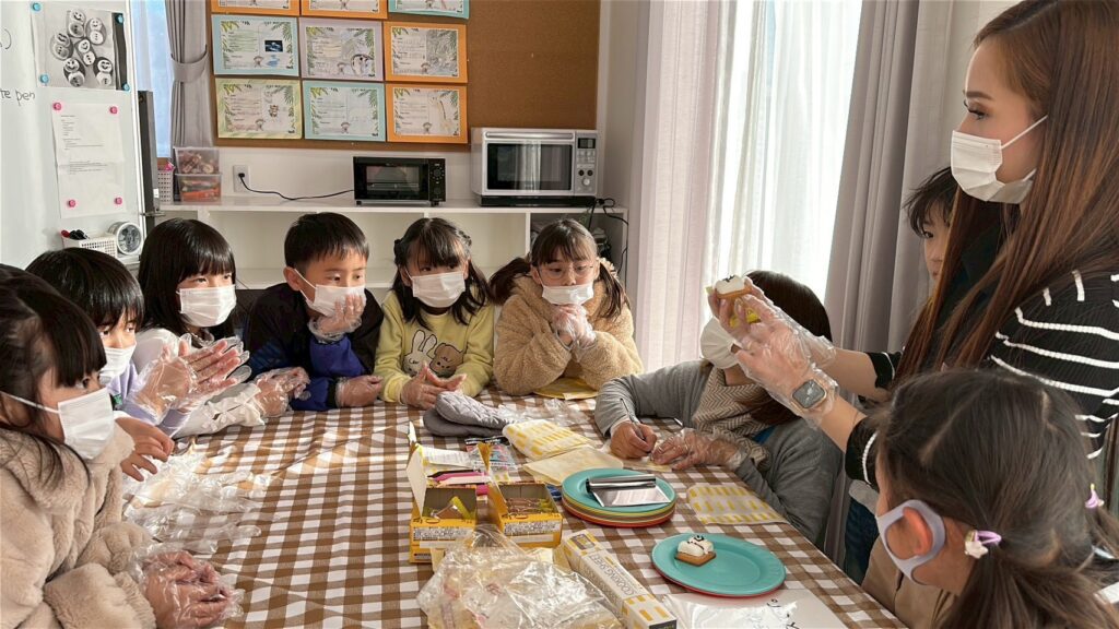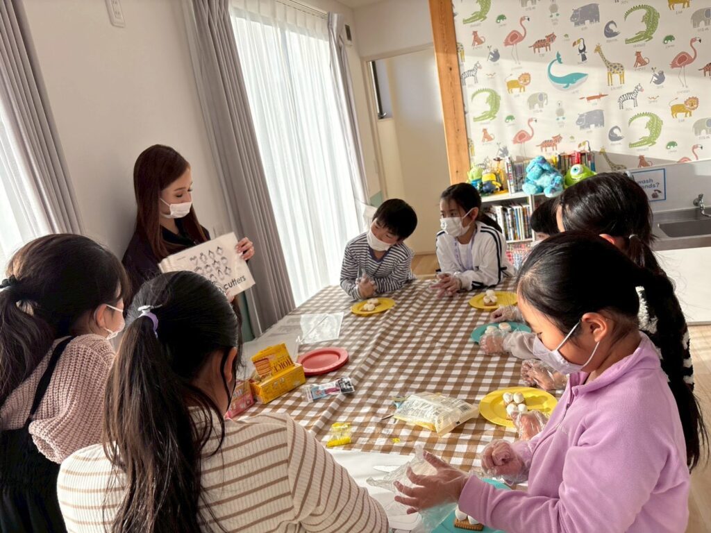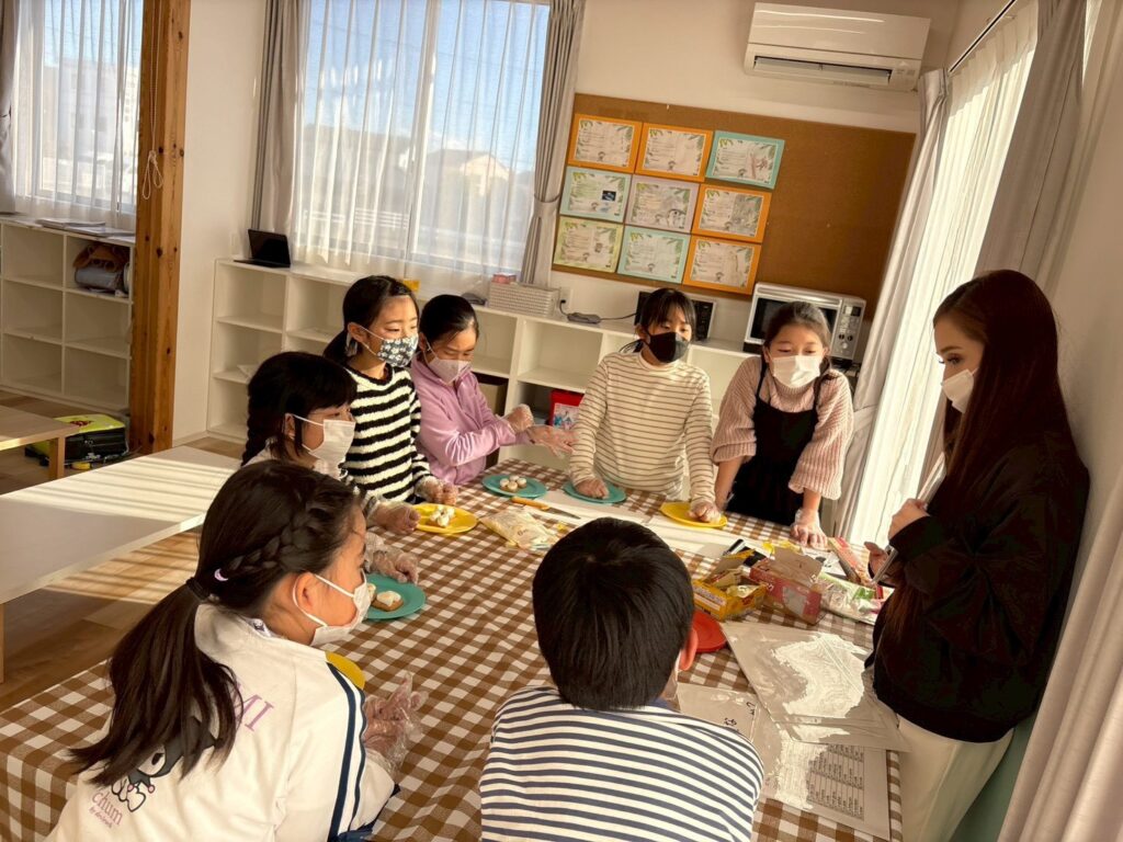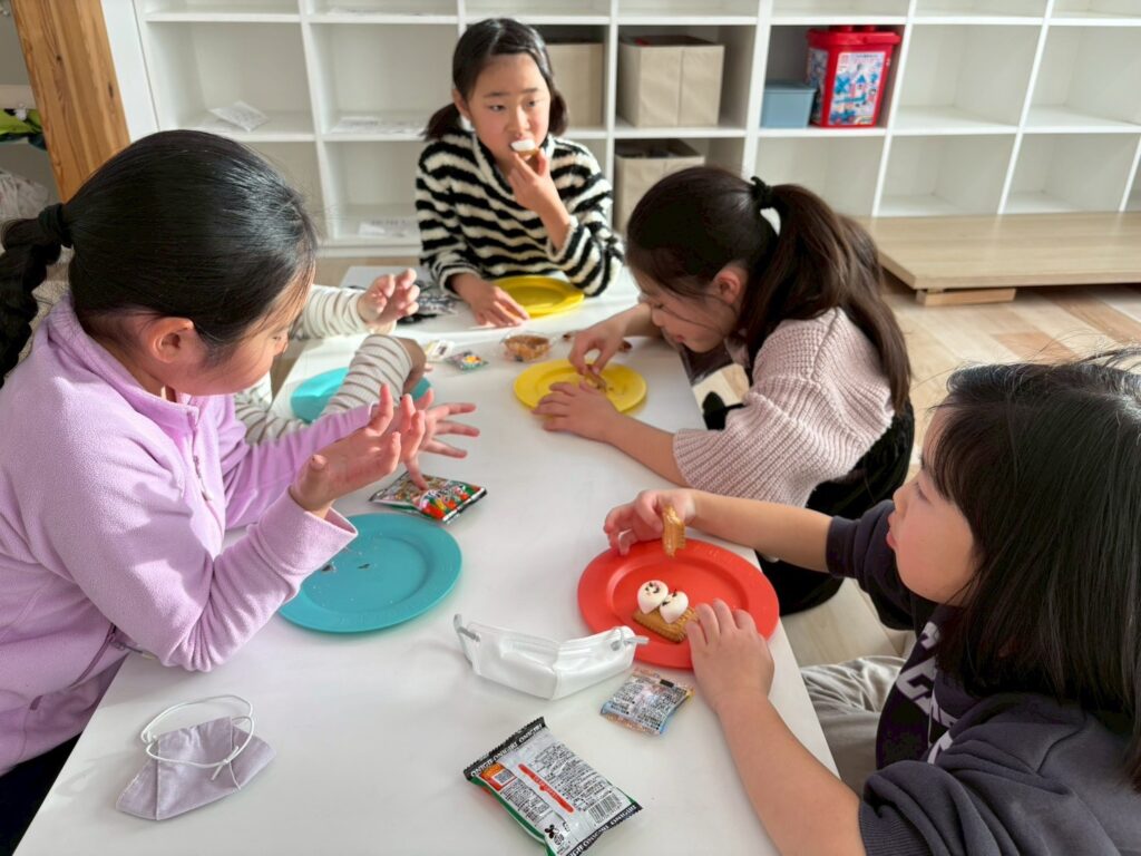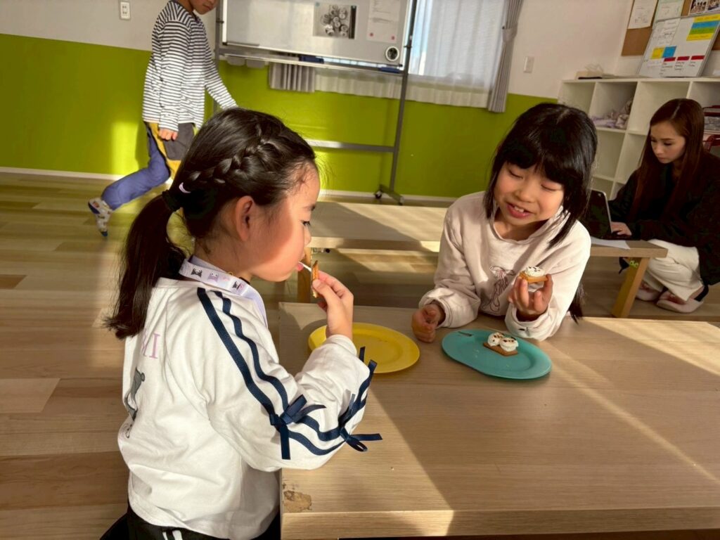 作る楽しさだけでなく、英語でやり取りをしながら進めることで、自然に表現も身についていきます。最後はみんなで「It’s delicious!」と笑顔いっぱい。楽しく学び、美味しく味わった冬のひとときとなりました。