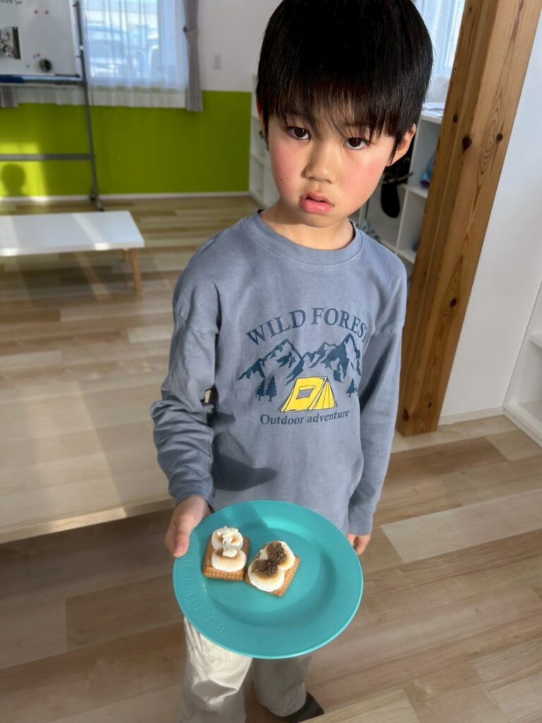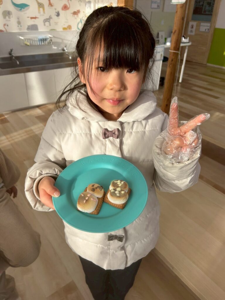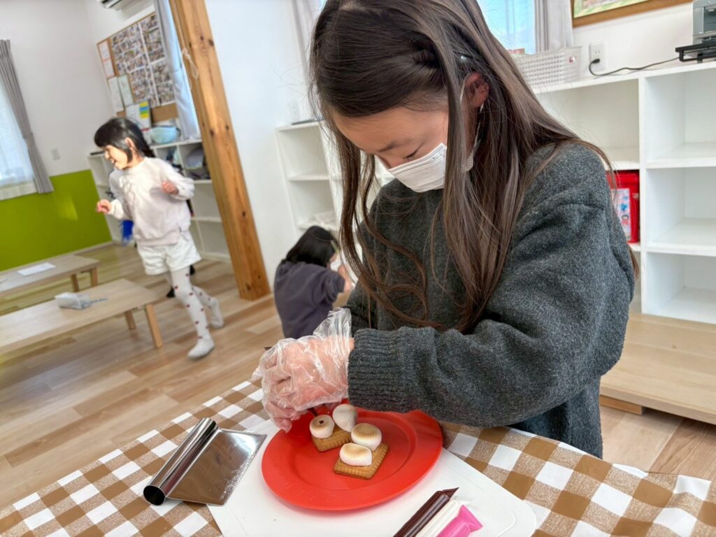 1月第3週のクッキングでは、雪だるまのデコレーションをしたスモア作りに挑戦しました。外国人講師の説明をしっかり聞きながら、「First, put the marshmallow on the cracker.」「Be careful, it’s hot!」と英語で手順を確認。子どもたちは真剣な表情で取り組んでいました。