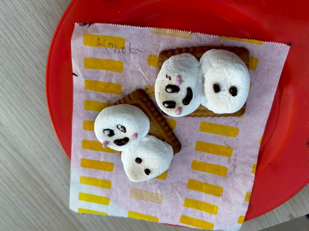 焼いたマシュマロをビスケットにのせ、チョコレートで目や口を描いていきます。「Look! It’s so cute!」「I did it!」と嬉しそうな声もたくさん聞こえました。雪だるまの表情は一つひとつ違い、とても個性豊かで可愛らしい仕上がりに。