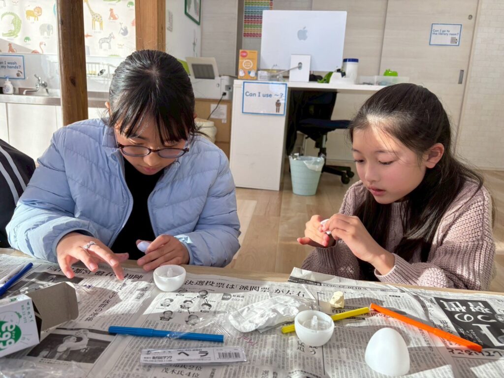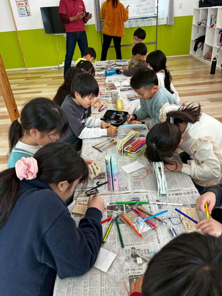 新聞紙を広げ、材料を分け合いながらスタートします。
