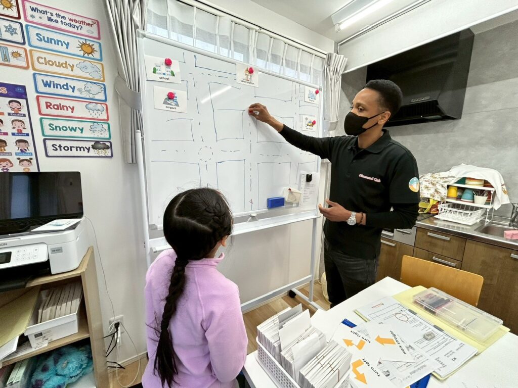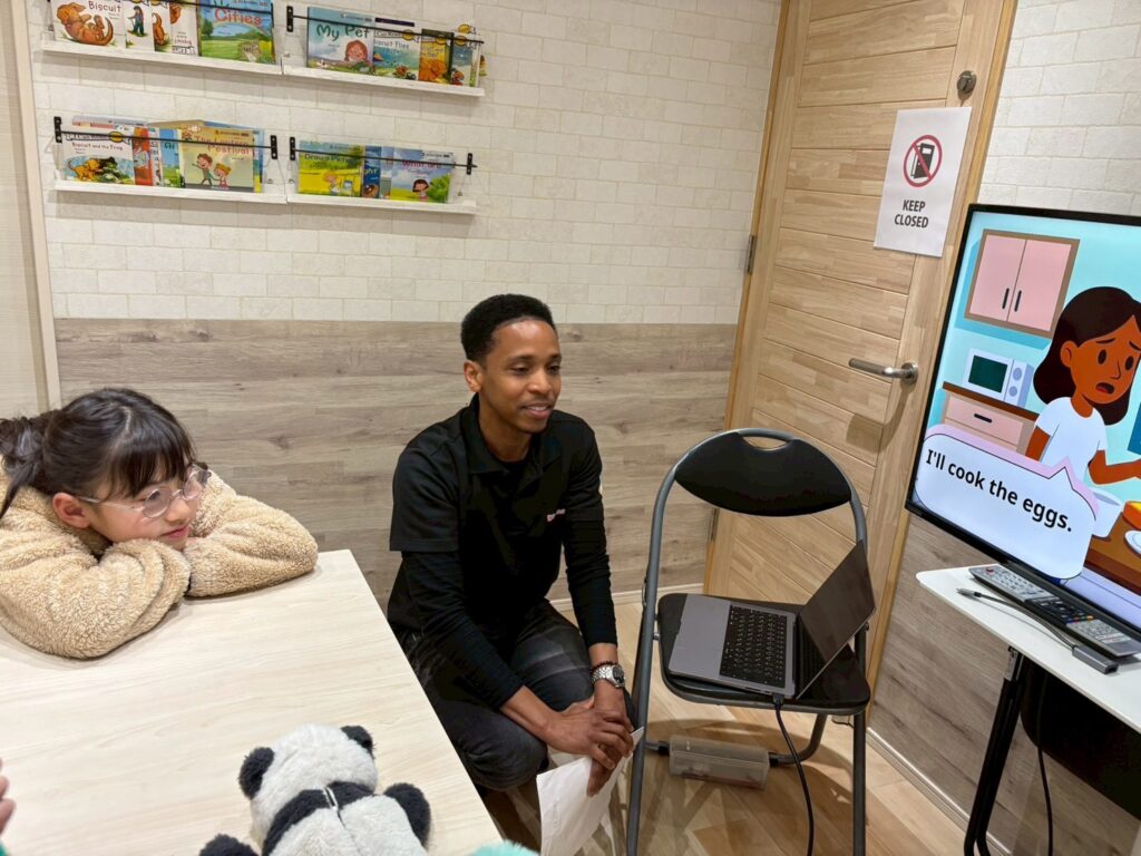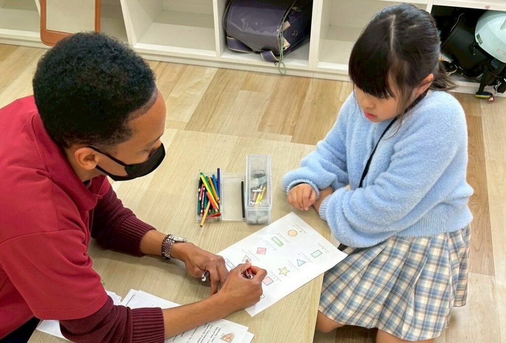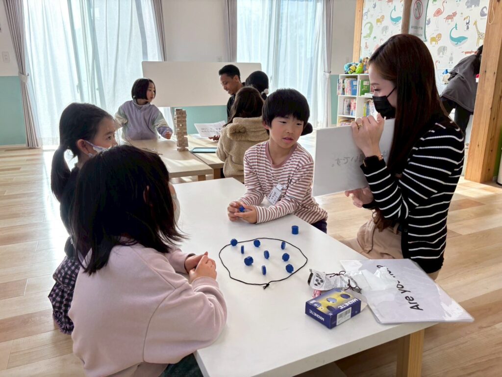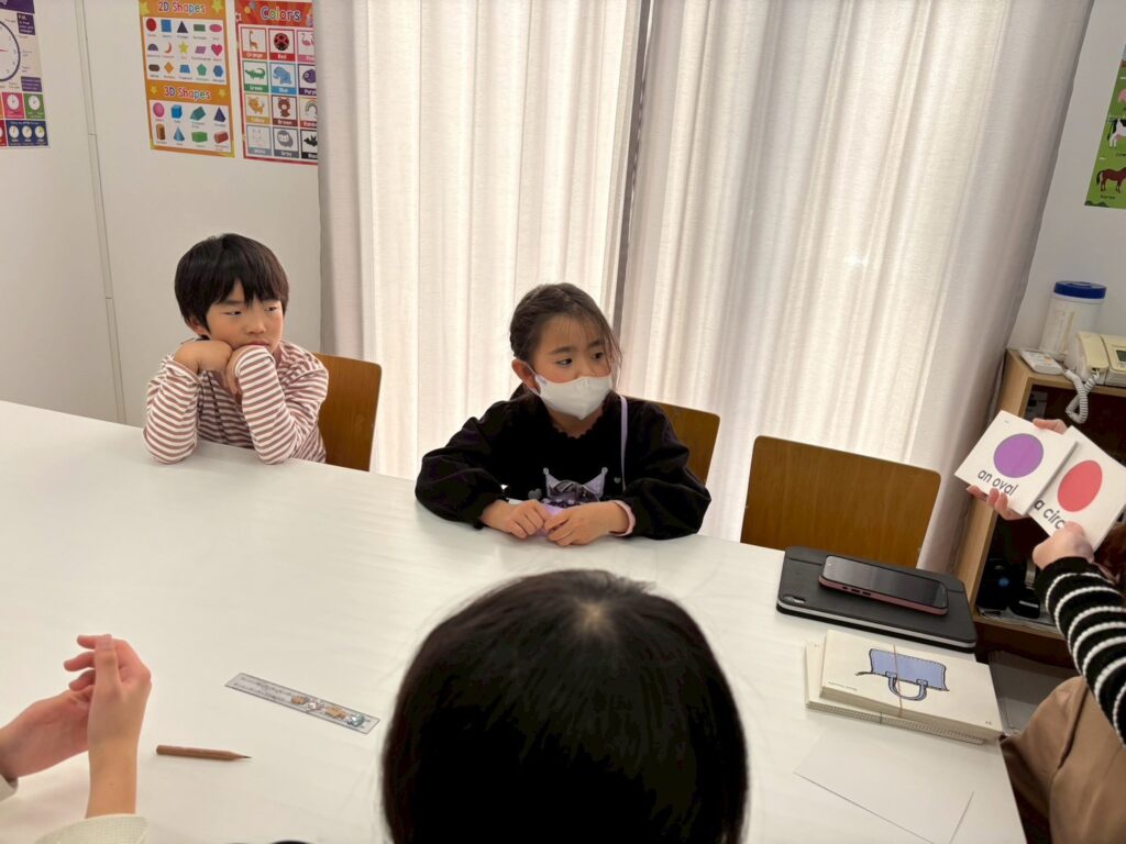 丸や三角、星など、さまざまな形のカードを見ながら、子どもたちは元気よく答えていました。ゲーム感覚のアクティビティの中で、自然と英語のフレーズを口にする姿が見られました。